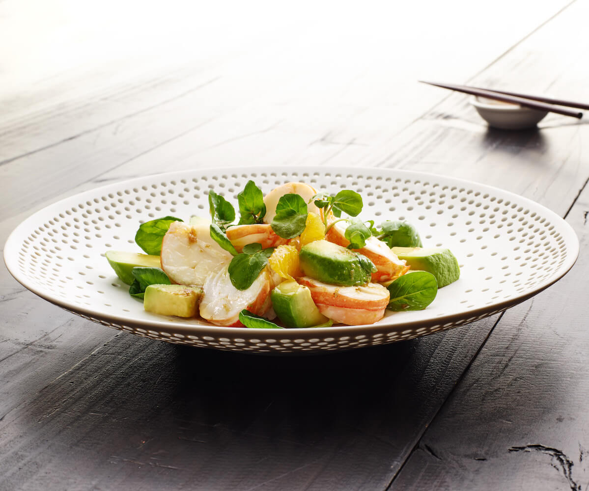 - If using horn/ leg meat, place it in centre of the plate and add a little dressing. Gently mix lobster slices, avocado, citrus segments, salad leaves with dressing and place on top.