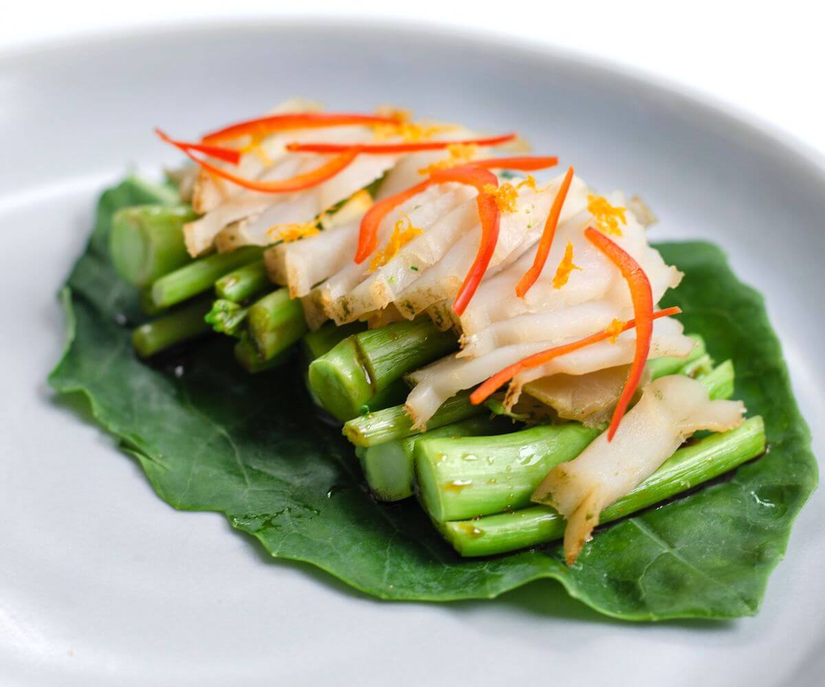 - Serve gai lan on a dish all sections aligned, dress with heated oyster or soy sauce. Lay sliced abalone over gai lan and garnish with sliced ginger and orange rind.