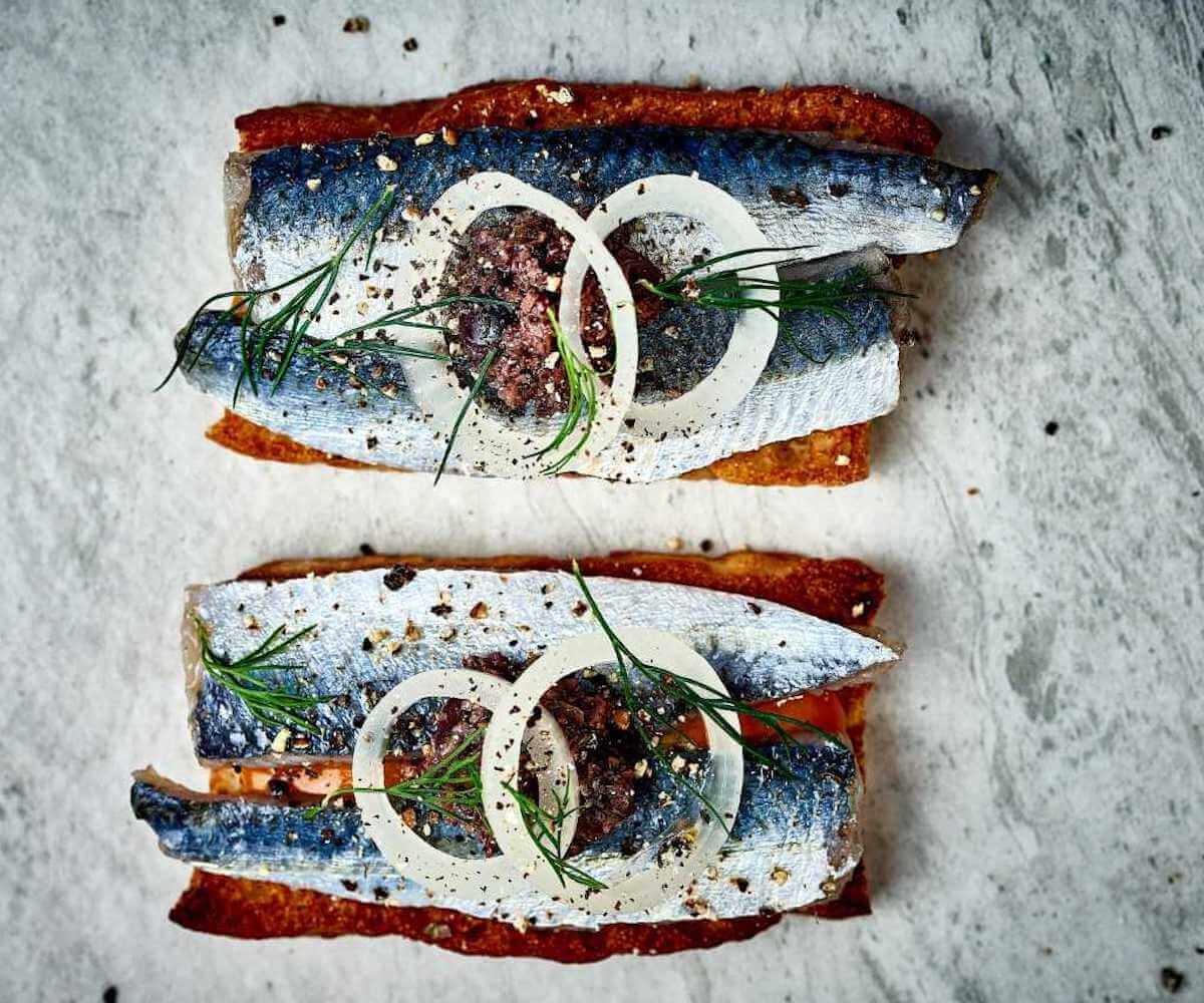 - Toast the baguette under a grill, turning once (1-2 minutes each side), rub with the garlic clove. Place 2 sardines onto the baguette, top with the tapenade, onion rings, a few sprigs of dill & some cracked black pepper.